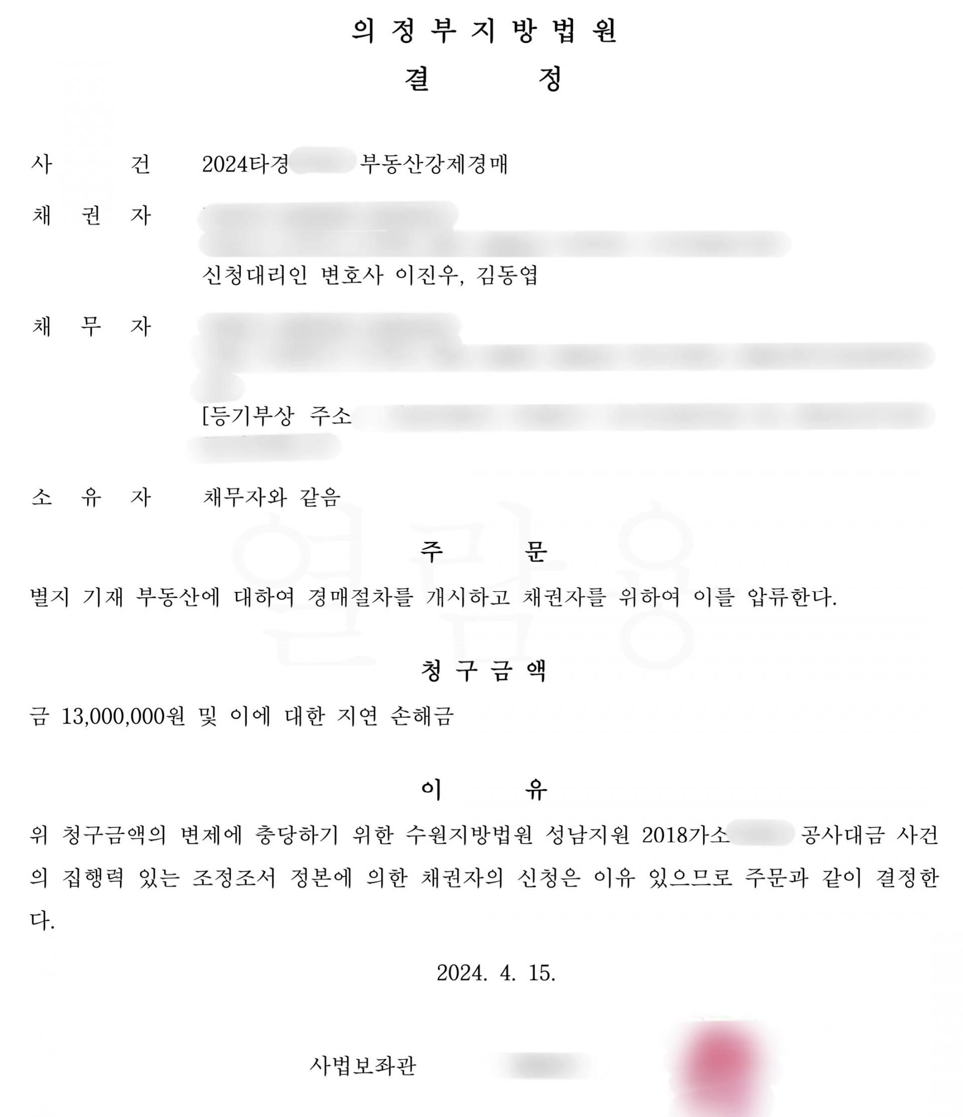 이에 변호사가 즉시 경매까지 진행하였습니다.